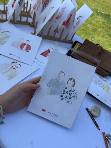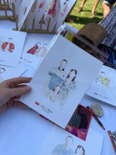Pendant votre vin d’honneur ou votre réception, j’installe mon espace d’illustration et crée en direct les portraits de vos invités.