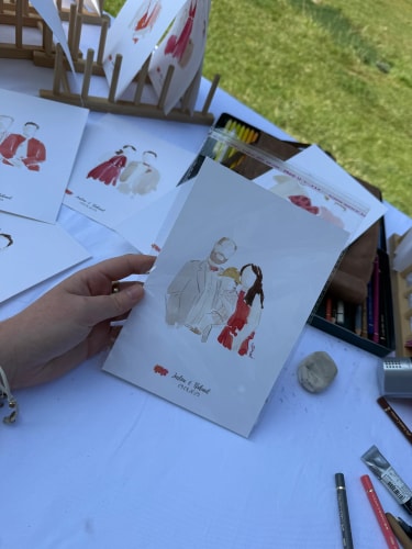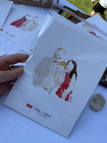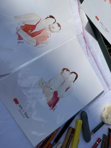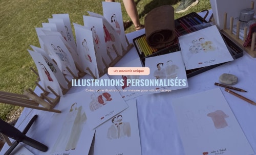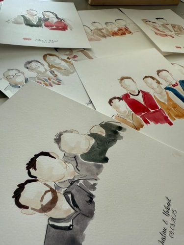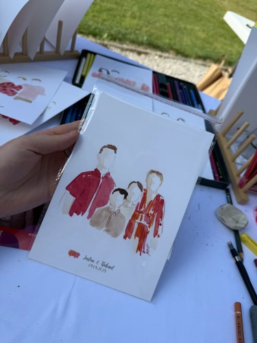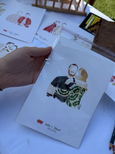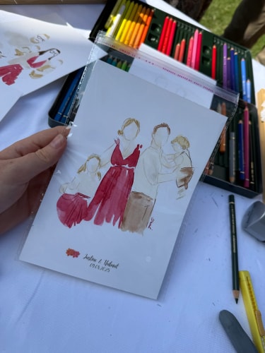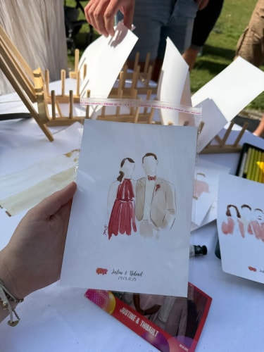 Je me déplace sur le lieu de votre mariage pour réaliser, en direct, des illustrations douces et colorées des mariés et de leurs invités. Chaque création est réalisée avec soin, délicatesse et sensibilité, afin de capturer l’essence de ce moment si précieux.